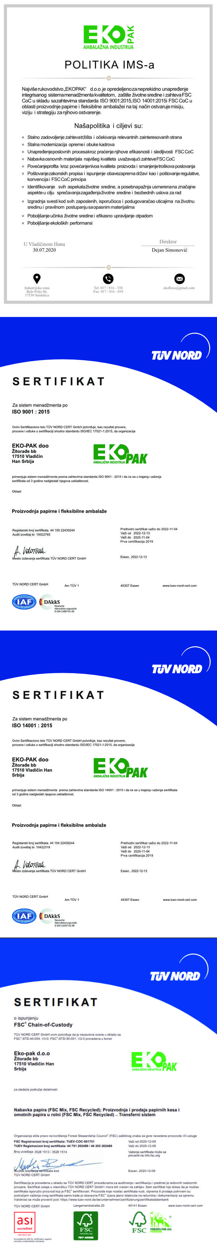 Kao potvrda rada i uspešne primene IMS-a je i dobijanje međunarodno priznatih sertifikata (sa znakom IAF), neposredno pred devetogodišnjicu rada EKO PAK (8 novembra 2013). Na sistem upravljanja IMS u EKO PAK-u primenjeni su svi zahtevi standarda SRPS ISO 14001:2005, i zahtevi SRPS ISO 9001:2008. izuzev zahteva tačaka 7.3 i 7.5.2.