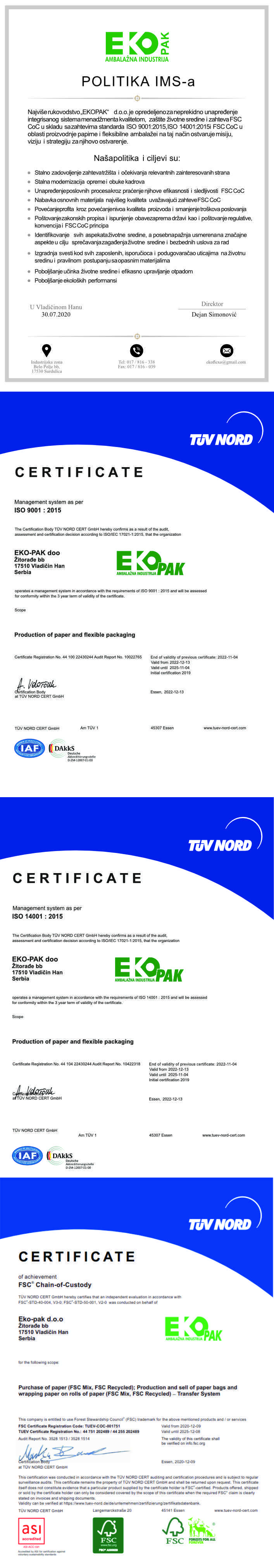 EKO PAK documents, applies and maintains IMS and constantly improves its efficiency through: applying IMS Policy, applying IMS documents and constant orientation towards interested parties (customers, owners, state, public)